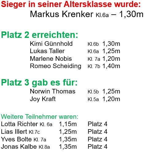 Am 12. März fand die Hallenkreismeisterschaft im Hochsprung für die Schulen des Zwickauer Landes in Wilkau- Haßlau statt. Mit einer kleinen aber feinen Auswahl von 11 Schülern nahmen wir an diesem Wettkampf teil. Es herrschte eine tolle Atmosphäre, die auch unsere Sportler zu erfolgreichen Leistungen anspornten.